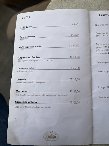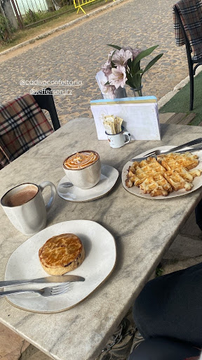 Read moreChegamos no Cadivó domingo logo que abriram e por isso estava vazio. A experiência já começou ruim pois o atendimento era sem vontade e as atendentes não sabiam se comunicar conosco, o pedido foi preparado rápido e ao chegar já foi decepcionante porque a "torta de frango" na verdade é uma empada(massa de empada e recheio de empada) além de ser bem pequena, na minha opinião. Outra decepção foi o "waffle de pão de queijo" que na verdade é uma massa de pão de queijo no formato de waffle, portanto é simplesmente um pão de queijo encarecido(e bota caro nisso). Das bebidas apenas o chocolate quente é realmente gostoso e valeu a pena, o capuccino e o café com leite estavam extremamente amargos, mesmo colocando 3 sachês de açúcar em cada bebida não consegui tomar elas até o final devido ao amargor. Outro ponto negativo foi a limpeza da mesa e das louças, o copo que serviram a soda italiana estava com muita sujeira empregnada por fora. Portanto nos arrependemos de visitar o Cadivó e não recomendados a ida por ser extremamente decepcionante, deixamos de tomar um café da manhã maravilhoso na Pousada (que já estava incluso na diária) e se for o seu caso, recomendo fortemente...
