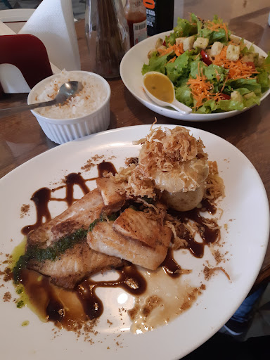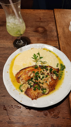 Read moreFoi um achado ao acaso. Entramos pra perguntar e lá ficamos pelo sorriso e simpatia das atendentes. Aline, por fim, foi a nossa condutora aos saborosos pratos da casa. Paciente e atenciosa, esperou que escolhéssemos nossos pratos: eu, meu marido e seu filho. Pedimos um risoto de limão com tilápia, que estava divino e serviu 2 pessoas adultas tranquilo!! O outro pedido foi o Tutu à mineira, igualmente delicioso. Pratos bonitos de se ver e saborear! Cerveja gelada, suco e água! Ao final, o brigadeiro de colher, muito bem servido e nada de ser "uma colherzinha" apenas, estava extremamente divino. Bom, pra mim que amo um chocolate meio amargo. Voltaremos com certeza em uma próxima oportunidade e...