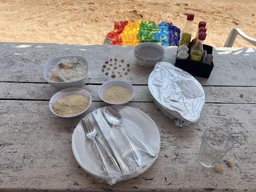 Mesas cobertas na beira da praia. Linda vista. Água limpa e morna. Atendimento bom. O peixe que estava apenas aceitável. Tava com uma aparência melhor do que o paladar. Talvez eu não tenha dado sorte e ido em um dia ruim. Mas voltaria pelo ambiente e atendimento que foi o melhor que tivemos na região. No fim das contas, valeu a pena...