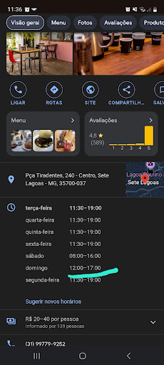 Atualizem os horários de vocês ou caso aconteça algum imprevisto e precisam fechar dentro do horário de funcionamento, postam na redes socias! Gosto muito da cafeteira e não quero deixar de visita-la nas próximas vezes que eu voltar na minha...