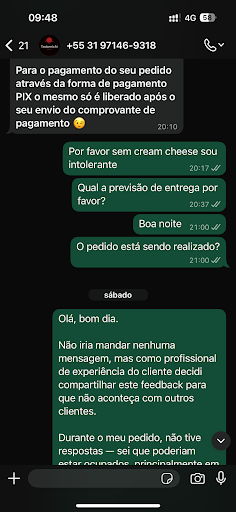 Read moreEu e minha família fizemos um pedido às 20h. 21h50 ainda não havia chegado, mandamos mensagem e falaram que já tinha saído. 22h20 não tinha chegado. Mandamos mensagem novamente e eles disseram que não sabiam o que havia ocorrido, mas que ligaria para o motoqueiro para resolver. Não deram nenhuma satisfação. Mandamos mensagem novamente 23h e ainda estavam dizendo que ia chegar. No fim, o pedido não chegou. Esperamos 3h, todos com fome e querendo comer o sushi. Mentiram que tinha saído. Acho feio culpar entregador de algo tão sério. Então, foi simples assim: pedimos, esperamos 3h, nos cuspiram desculpas sobre o que pode ter acontecido e o pedido não chegou. Quanta falta de respeito. Já pedi outra vez também que o pedido veio errado e o arroz do sushi veio duro. Não queria pedir aí novamente mas minha mãe...