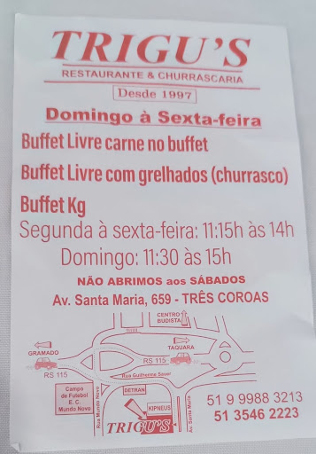 Read moreUm mês atrás, exatamente no dia 11/07/2025, eu, minha esposa, meu filho e a namorada, fomos almoçar no Trigu's. Já na porta fomos recebidos pelo Giovani que nos orientou e apresentou o restaurante. Todos super atenciosos, educados, prestativos. Comida ótima com um preço ótimo! Almoçamos muito bem, comemos sobremesa muito boas com direito a cafezinho e chá. Por fim, o Giovani ainda nos brindou com algumas informações turísticas da cidade! Na próxima vez que passarmos pela região, com certeza, iremos voltar e saborear a excelente comida. Continuem assim!...