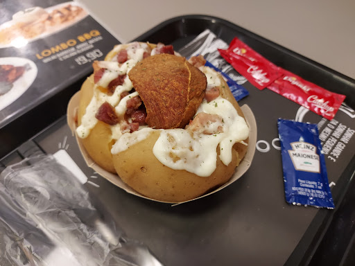 O lugar é grande, climatizado, conta com banheiros limpos , claros e decorados, possui área externa aberta e com pequeno parquinho para crianças de até oito anos. Funcionários simpáticos. Entrega por aplicativo, página do insta com boas informações. A respeito da batata, por isso vai levar 4 estrelas. O recheio tava mais superficial então sobra muita batata pura, não gostei tanto. Já as porções pelo que vi nas outras mesas vem com quantidade generosa, e os...