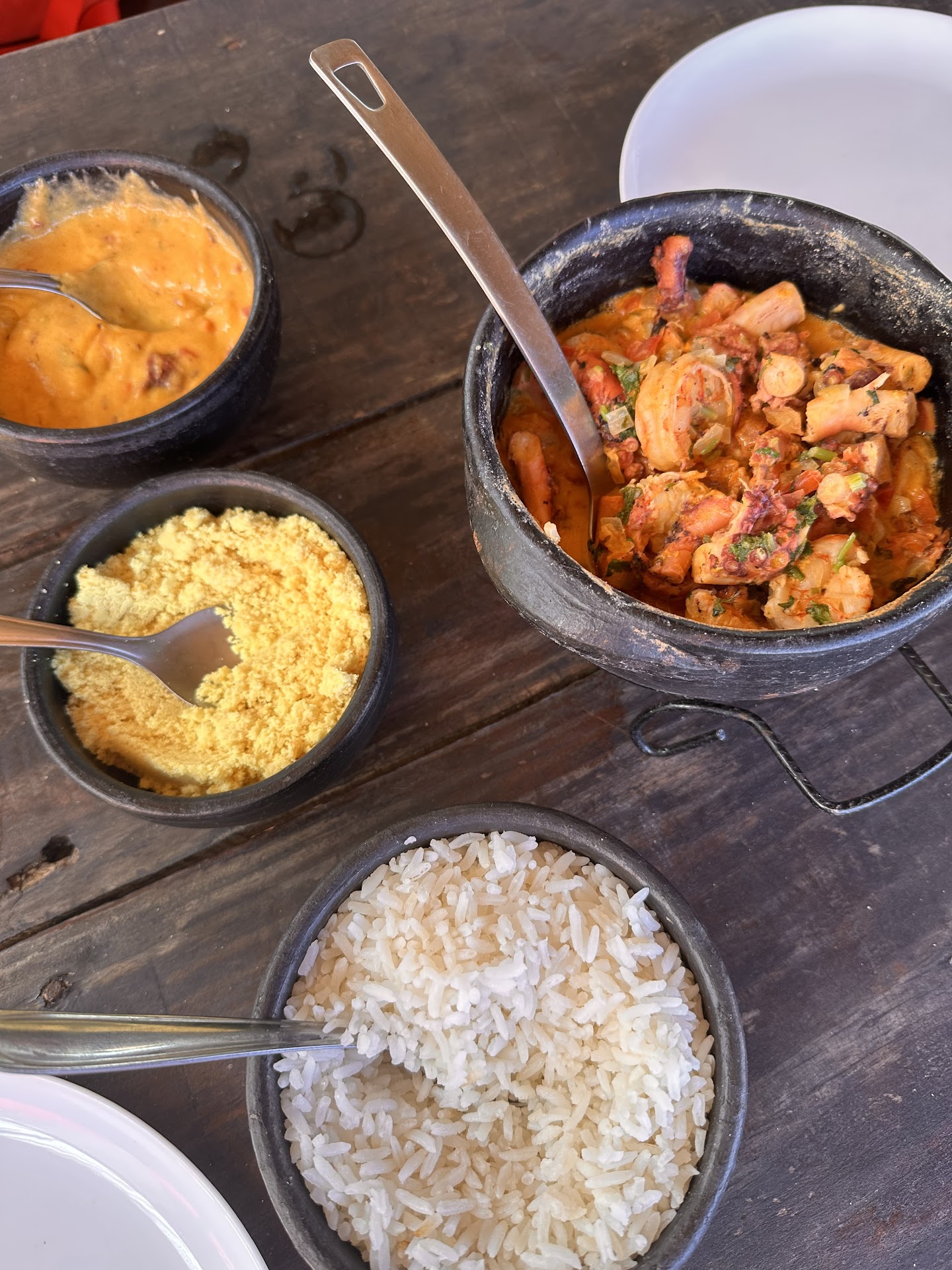 Fomos felizes nos dias que passamos em Corumbau! E uma das pessoas responsáveis por isso foi a nossa anfitriã da praia, Regina, com seu sorriso e simpatia constantes. Praticamente ancoramos na Barraca da Regina todos os dias. Desde as cerveja geladas, os petiscos deliciosos e almoços memoráveis. Precisamos TB destacar o atendimento impecável da dupla Ramon e Beto! Destaque para o bobó, o arroz de polvo e a muqueca de polvo com camarão. Eita, já deu água na boca...