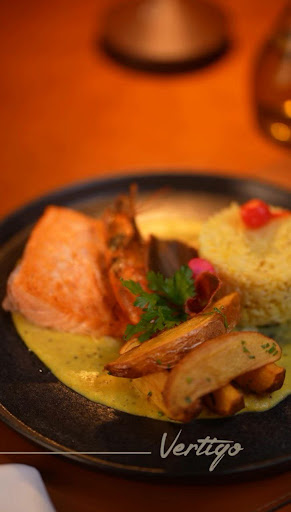 Estava com expectativas bem altas pra esse restaurante, mas, infelizmente, não foram atendidas. Saí bem decepcionada. primeiro, pedi o carpaccio de filet que tava uma delícia! Ponto positivo, gostei bastante e só aumentou minhas expectativas para o prato principal. Depois, pedi o salmão mediterrâneo que tava bem... Ok? Não era um prato ruim, mas minha intenção definitivamente não era pagar 112 reais em um prato apenas ok. O prato chegou bem rápido, o que me surpreendeu, mas estava na temperatura ambiente. Não era pra estar quente? Afinal, em tese, ele tinha acabado de ser feito. Achei bem pouca a quantidade de molho e de tempero. As batatas não tinham muito gosto e o arroz também tinha um sabor bem distante. Senti muita, muita falta de mais molho no prato, teria melhorado 100% a experiência. Pedi também o pastelzinho de camarão e gostei bastante, principalmente com o molho, muito bom! Por fim, pedi um tiramisù pra viagem e era ok também. Resumindo: pelo visto a especialidade do Vertigo são as entradas. Deliciosas! Pena que não tirei foto de nenhuma pra ilustrar a avaliação. Por curiosidade, enquanto escrevia, decidi procurar imagens do salmão mediterrâneo pra comparar com o prato que recebi. E só aí percebi que, realmente, a quantidade de molho que eles divulgam no Instagram e no Ifood é bem maior do que a quantidade que veio no meu prato (será se eu fui a azarada sorteada com menos molho? Ou se realmente é uma prática comum do estabelecimento oferecer pratos distintos do que prometem?) E só agora percebi, também, que faltou o camarão belle no meu prato, e que mandaram tomate cereja no lugar da pimenta biquinho. Uma pena! É um lugar que tinha tudo pra valer o preço, mas é bem mais ou menos pro que se propõe. Se um dia eu voltar, só pedirei entradas xD