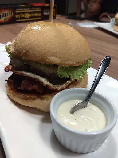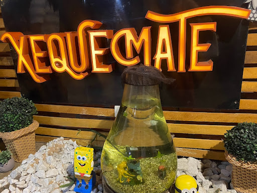 Para ir ao lugar é necessário fazer uma reserva, sua ou de quantas pessoas estarão com você. O espaço é bem aconchegante, muito belo. O motivo da reserva é devido o limite de mesas e cadeiras, para tanto uma entrada de 12 reais é cobrada por pessoa, mas que garante acesso a alugar quantos jogos se quiser, que é o tema e a proposta do restaurante, um salão de jogos de tabuleiro. Quanto às comidas, provei os anéis de cebola. Achei a crosta não tão seca quanto se deveria esperar. E o molho barbecue, que parece acompanhar todos os pedidos, tem um sabor artificial que logo se torna desagradável. Terminei os anéis de cebola, mas por serem oleosos não se dá para comer muitos. Os pastéis de queijo e de carne são secos (sem óleo) e recheados, também vieram com o bendito molho barbecue pré-pronto, não usei porque eles em si já são bons. As esferas do dragão são minúsculas e também são oleosas, o maior problema delas é a falta de recheio. Comi sem saber de que eram. Sabor massa talvez, e também acompanhadas do bendito molho barbecue, que eu já nem mais encarava. Em seguida, pedi um hambúrguer combo Duque. Acompanha mais pastéis, o hambúrguer, um suco de laranja e o bendito molho barbecue (olha, eu estava para implorar por uma maionese temperada). O pão do hambúrguer é macio e gostoso. A carne do hambúrguer, porém, estava seca no interior, não estava suculenta. O molho interno veio muito líquido e se derramou quase todo quando inclinei o hambúrguer, um pouco mais consistente e estaria perfeito. No geral, a experiência valeu a pena. Eu não voltaria para o Xeque-Mate pela comida. Voltaria pelo aconchegante lugar, pelos jogos maravilhosos, pela energia boa do espaço e dos funcionários e por uma porção grande de pastéis de queijo e um milkshake (que será minha próxima pedida...