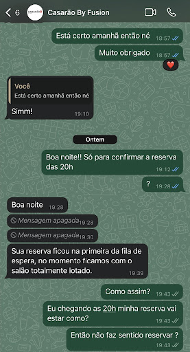 Read moreÉ indiscutível que caso um serviço não seja adequadamente prestado ou um produto apresente defeito, o consumidor tem pleno direito de reclamar! Venho aqui hoje com uma indicação sem tamanho que ao aguardar exatas 1:25 na fila para uma reserva já feita a atendente me informar que não haveria lugar mesmo (ah me desculpa) sendo que a mesma ao eu chegar às 20h me disse que teria que aguardar uns 15/20min. Eu uma RESERVA CONFIRMADA POR ELES MESMO para meu aniversário com minha família simplesmente tivemos que ir embora porque a minha reserva foi passada a outra pessoa por livre espontânea demanda. Então não convém fazer a reserva? De que vale reservar? Enquanto aguardávamos o tempo, se passaram muitas pessoas na nossa frente, entendo que eram números menores. Mas não nos foi informado algum momento? Nos foi oferecido alguma outra mesa para menos? Passaram nessas 6/9/14 pessoas e nenhum momento nos foi ofertado alguma delas. Estávamos com crianças com fome e nem se quer deram ao trabalho de oferecer mesas as crianças. Péssimo atendimento, péssima organização, péssimo tudo! Todos os sentidos. Vou colocar o print da conversa, para ver que eu confirmei fui atrás e me foi confirmado, pois soube do mesmo acontecido na semana passada e o gerente teve a cara que de dizer que estão estudando como mudar essa questão. Porém vai faltar estudo e muito. Mas fica aqui minha indicação NÃO VAO, em datas comemorativas, pois é frustrante isso. E como podem ver a mensagem de hoje confirmando foi apagada por eles mas eu havia lido que estaria até as 20h e foi a hora que...