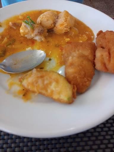 O restaurante falou em salmão, camarão... Não tinha nada disso, tinha um pirão de peixe, mexilhão, cação e tilápia... Camarão e Salmão, não vi nem a cor, não tinha nem uma simples lasanha no buffet. As proteínas bovinas e suínas no dia, também, de baixíssimo custo, um suíno assado, um bife acebolado que deveria ser de carne de segunda, e uma outra carne, acho que o corte era tatu... A melhor coisa que comi, foi um anel de cebola frito... 99 R$ o kg.
