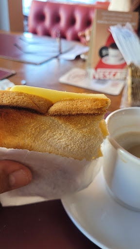 Read moreDe passagem pela cidade parei nessa padaria que tem até estacionamento para clientes. Serviço de self-service a quilo, os produtos pareciam passados, mas insisti numa torta de maracujá e me dei mal. Pedi 2 cafés que demorarem um pouco, considerando haver apenas 3 pessoas sentadas no salão vazio, que já dá indício da qualidade do local. Pior foi o queijo quente num pão de forma seco que sequer passaram manteiga, estava frio e o queijo nem chegou a derreter de tão frio. Não recomendo. O salão é até agradável, mas poderiam trocar o forro rasgado dos assentos. Banheiro feminino sem...