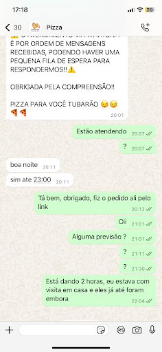 Read moreTive a pior experiencia já na primeira compra, pedi um combo com 3 pizzas grandes e 1 refrigerante, não pediria tanto se não estivesse com visita em casa, mas após 2hrs de espera, até a visita desistiu e foi embora com 1 hora de atraso, deu tempo de chegarem no destino deles que era garopaba e nada da pizza ( segue os prints abaixo ). Mandei mensagem para a pizzaria mas não obtive respostas. Eu moro perto da pizzaria e mesmo depois que saiu para entrega demorou para chegar na minha residência. Trabalho em restaurante e sei que com alta demanda pode haver atrasos, mas nesse caso, se não estão dando conta, fechem o delivery por uma meia hora até voltar ao normal, coitados desses funcionários que tem que dar conta, porque duvido que isso caia para gestão. A pizza é realmente barata e fui avisado por amigos que era uma "solinha" e realmente, parecia massa de crepe era fina e dura, pelo fato disso ela fica gelada bem mais rápido do que uma pizza comum ( mas pelo preço, era de se esperar ). Não comprarei novamente e...