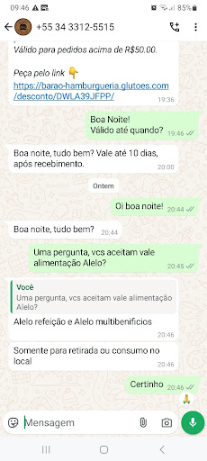Na noite de ontem, enviamos uma mensagem via WhatsApp para a Barão Hamburgueria para confirmar a informação divulgada pelo estabelecimento de que aceitavam Vale Alimentação VR. A resposta foi afirmativa, com a observação de que o benefício seria aceito apenas para consumo no local ou retirada. Com base nessa confirmação, fomos até a hamburgueria — eu, meu marido e nossa filha de 3 anos.