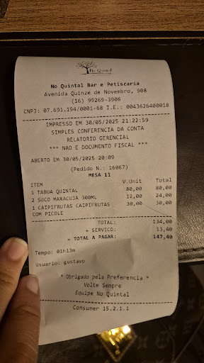 No Quintal Bar e Petiscaria possui um ambiente amplo, mas ao mesmo tempo não tem muito espaço para mais mesas. Então a recomendação é chegar cedo nos dias mais movimentados. A decoração é bem estilosa: orelhão, árvore no meio do salão, TV e balança antigos etc. A porção de itens variados (bolinho de arroz, coxinha, torresmo, batata frita com bacon e cheddar, mini churros) que pedimos serve bem 2 pessoas, mas em três conseguimos dividir e ficarmos satisfeitas. A caipirinha é maravilhosa e bem servida, tanto em quantidade, qualidade e apresentação, pois veio envolta em um regadorzinho muito fofo. E o preço justo. Com certeza...