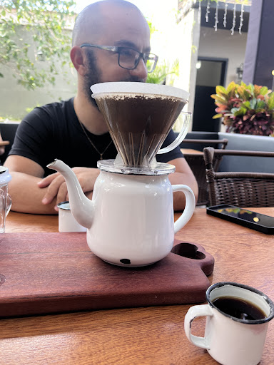 Fui no sábado de manhã visitar o local. O ambiente é simples perfeito! Fiquei na área externa, é fresco, bonito, muito bem organizado. Outra coisa que gostei muito foi do atendimento, apesar de ter atendimento pelo cardápio online, os garçons vão a sua mesa e entregam o cardápio físico se precisar, anotam e entregam o pedido com muita cordialidade. Os pratos chegaram bem rápidos. Pedimos o pão de queijo recheado com queijo minas e pernil, também pode escolher uma geleia, pedi a de mel e adorei, meu marido pediu de goiaba e gostou também, o prato no geral e muito bom, custou uns 26 reais cada, pedi também uma mini pavlova de ferrero rocher, que me surpreendeu muito positivamente, a base é uma especie de suspiro com um creme suave, chocolate e muitos pedaços de ferrero rocher, por ser pequeno não fica enjoativo, paguei uns 17 reais. Pedimos um cappuccino brasileiro, muito gostoso, cremoso e doce na dose certa, na minha opinião. Pedimos também um café filtrado na hora (kono) que eu não gostei, dizia no cardápio que ele seria bem concentrado e intenso, eu não achei, inclusive achei ralo e fraco, além de que esfria muito rápido, pagamos uns 24 reais por 300 ml, esse eu não recomendo. O valor final para duas pessoas ficou em torno de 120,00 reais, um valor alto, mas perfeitamente compatível com os valores médios desse tipo de estabelecimento, considerando a qualidade dos pratos, e todo o restante, achei um valor justo, dificilmente vai encontrar um café de qualidade como esse por menos de 100 reais em Uberlândia. No cardápio uma grande variedade de opções, mas com os pratos que pedimos fiquei muito satisfeita e não consegui pedir mais nada. Com certeza vou voltar para testar outros pratos!