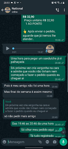 Um dos piores atendimentos que eu já recebi. Fiz um pedido pelo app, e após 30 minutos de atraso, fiz contato pelo chat para verificar se havia ocorrido algum contratempo, e fui informado que o pedido já havia saído. Informação que eu já tinha verificado pelo app, então foi mencionado que iriam ligar para o motoboy para entender o que houve. Aguardei alguns minutos e sem resposta, então liguei no estabelecimento, expliquei o houve, com toda educação, e o atendente simplesmente disse que meu pedido havia saído. Então eu perguntei se ele poderia fazer contato com o motoboy, pois já estava com meia hora de atraso, com relação ao previsto. A previsão quem fornece é o estabelecimento ! Então ele diss que o motoboy não saiu somente com o meu pedido. Respondi a ele, que então deveriam alterar o prazo de entrega no app. O atendente não moveu um centímetro para encontrar uma solução. Mandou eu cancelar o pedido e ainda desligou na minha cara, duas vezes. Péssima experiência, não indico e não desejo...