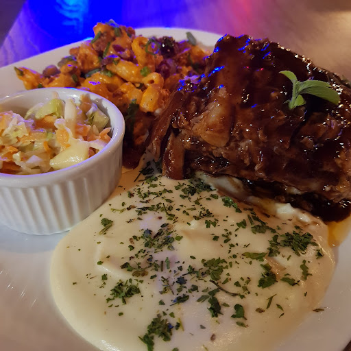 O American food é uma delícia! Costela super derretendo com muito barbecue e purê de batata mais saladinha de repolho agridoce.