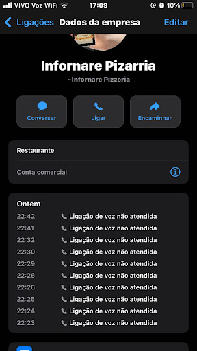 Pior atendimento de Unaí-MG. Fiz um pedido anteontem dia 26/12/2021 as 20:00 na Pizzaria Infornare, confirmaram o meu pedido e deram previsão de 1h para entrega. Quando deu 22:30 ligamos pois a entrega já tinha atrasado meia hora, eles não nos atenderam, fizemos mais de (150 chamadas), eles deixavam cair na caixa postal ou DESLIGAVAM. Mandei mensagem e liguei no WhatsApp e no Instagram deles, e ninguém respondeu. (TENHO PRINT DE TUDO). Eles entregaram o pedido DEPOIS DAS 23:00 - 3 HORAS DEPOIS - éramos 10 pessoas, meus convidados já tinham ido embora sem comer, e já estávamos todos deitados! Fico indignada com o desrespeito com o cliente. Esperaria que um restaurante, fosse minimamente honesto com seus clientes. Esse tipo de descaso é inaceitável. O restaurante tem obrigação de avisar seus clientes antecipadamente se não houver condições de cumprir seus prazos de entrega. Dessa forma, o cliente poderá buscar outras alternativas.