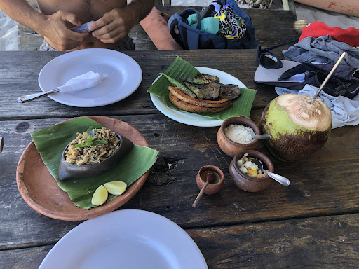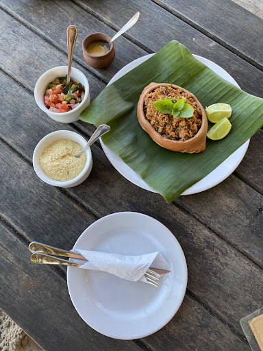 In front of the Moreré beach, you can have one of the best baked fish with vegetables. We got at the Amendoeiras by 5 pm after a long day at the natural pools around the island, and a delicious, whole fish wrapped up in banana leaves was waiting for us. It was incredibly tasty and fresh and the roasted vegetables made a great side dish with farofa, pirão, baião de dois and vinagrette sauce. We love it!