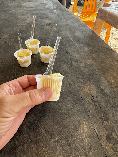 Abordé sur la plage par une personne fort sympathique, nous proposant de manger à un tarif très abordable, en nous promettant une Caipi et un dessert offert et un repas copieux à souhait. L’ambiance était très bonne avec des activités à disposition type raquette, paddle, hamac… La caipi (moyenne) a bien été offerte. Mais malheureusement la nourriture était à revoir, nous avions pris des langoustes pour 4 personnes sur lesquelles nous devions manger pour 5 en théorie, mais en pratique il n’y en avait même pas pour 2, la moitié des langoustes étant dépourvu de chair (très certainement prélevée pour servir dans une moqueca..) et malgré nos remarques, ni le patron ni le cuisinier n’ont reconnu leur erreur de nous avoir servi des langoustes VIDES nous répondant qu’elles ont été pêchées comme ça, vivante mais sans chair??? Et le dessert a bien été offert mais à sa place j’aurai honte d’appâter les clients avec ce stratagème et de servir un dessert minuscule dans un verre en plastique de la taille d’un ristreto! Bref allez y pour l’ambiance ou boire une bière mais pas...