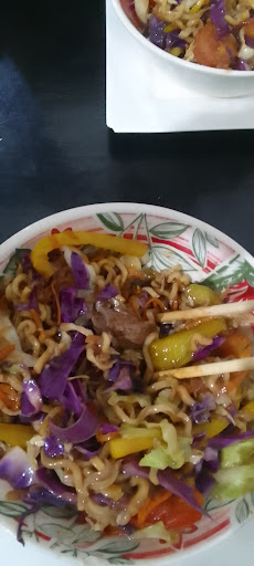 A foto tá péssima, porque até a experiência com a comida foi péssima. No caso, o atendimento e local do estabelecimento foi ótimo, porém, a comida japonesa servida não foi a mesma coisa. Pedimos yakisoba de frango e carne, mas pareceu que pedimos de legume. Os legumes foram cortados grossamente, o yakisoba veio com bastante caldo, do qual, estava super mega doce, a carne estava dura e cortada grossa também e o macarrão parecia ter ficado de molho no caldo do qual veio estufado. Não conseguimos comer, largamos o conteúdo da foto no prato. Também pedimos um doce, mas não tenho muito que falar sobre ele, além de que não gostamos, mas admito que neste caso, foi uma questão de gosto pessoal.