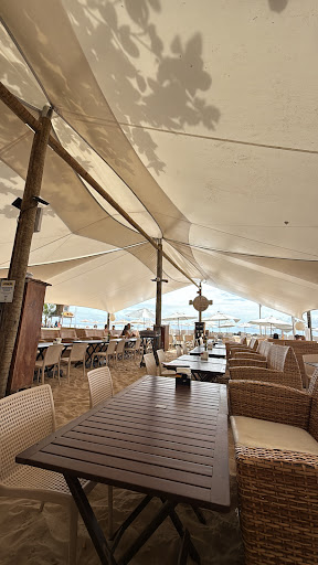 A vibe do restaurante é simplesmente encantadora. Durante o dia, a claridade do sol realça o branco da tenda e cria uma cena quase cinematográfica, enquanto a brisa do mar refresca e embala cada momento. À noite, o ambiente ganha uma nova vida: a iluminação suave e a música criam uma atmosfera romântica e sofisticada, ideal tanto para um jantar a dois quanto para uma celebração com amigos. É o equilíbrio perfeito entre o descontraído da praia e o requinte de um lounge sofisticado.