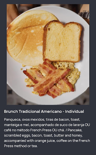 Read morePelo Instagram tudo é mais bonito. Essa é a realidade, rs. Pedimos o brunch individual e no cardápio digital dizia que vinha ovos mexidos e tiras de bacon. A intenção seria só eu comer o pq meu namorado é vegetariano. Mas eis que chega um ovo mexido todo impregnado de bacon. 🤡 Quando mudar algo no cardápio, AVISE pro seu cliente! Pq ele está esperando vir exatamente o que diz na descrição e o que a imagem mostra. No fim sobrou metade do ovo pq só eu comi. Não ofereceram trocar o ovo e eu não pedi pra trocar por insistência do meu namorado que não queria incomodar. As sobremesas estavam ok. Nada especial.