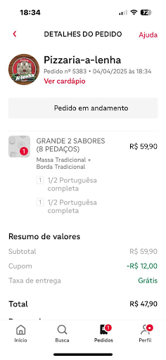 Read moreApareceu no Ifood uma promoção e eu logo fiz o pedido. O pedido foi confirmado e foi para preparação e eu fiquei esperando a entrega, passado mais ou menos meia hora o pedido foi cancelado..liguei pra lá para saber o motivo e eles disseram que erraram ao digitar o preço no app...Acho q se eles tivessem um mínimo de respeito pelo cliente, eles enviavam o pedido dos que já tinham pedido e acertava o valor no app para os próximos pedidos, mas eles cancelaram e deixaram o cliente na mão...portanto, caiam fora dessa empresa que é uma cilada! Não indico essa empresa a ninguém!