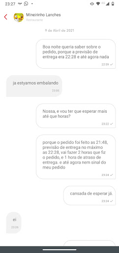 Simplesmente não recomendo a ninguém, falta de respeito com cliente/consumidor. Fiz meu pedido a eles as 21:48 do dia 09/04/2021 pelo app ifood, com previsão de entrega às 22:28, pois a lanchonete fica próximo a minha residência. Às 23:00 mandei msg para o local para saber do meu pedido por causa do atraso, demoraram a responder, mas informaram que já estavam embalando o meu pedido, depois de 20 minutos da resposta, perguntei mais quanto tempo teria que esperar, porque já estava cansada de esperar, porque já estava praticamente esperando 2 horas desdá hora que foi aceito o pedido, e 1 hora de atraso desdá hora que foi estipulado a entrega, e eles simplesmente cancelaram meu pedido, sem da explicação. Me deixando no horário de quase meia noite com fome, e tendo que procurar outro lugar que ainda estivesse aberto esse horário para pedir algo. Simplesmente uma falta de respeito, e ainda ter que esperar dias para conseguir o estorno do meu dinheiro, porque paguei no débito. Então imagina tamanha indignação com essa falta de respeito.