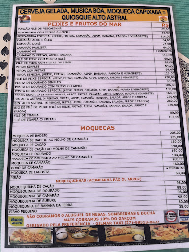 Read moreGente, o atendimento da galera é uma arraso! Para vocês terem ideia, o local não serve café, mas minha mãe meio jeito dona Herminia queria um café kkk uma das atendentes arrumou um cafe da própria garrafa dela! Minha mãe super cafezeira ficou feliz da vida! Gosto muito de Setiba, já fui em vários quiosques, todos muito bons! O Alto Astral melhor ainda! Parabéns pela equipe!