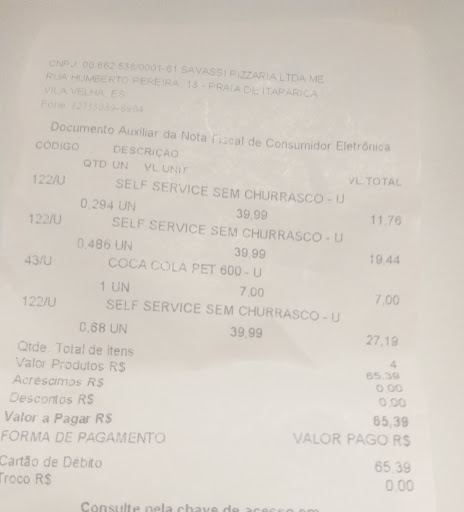 Read moreNão recomendo de forma alguma!!! A comida é bem básica, e atendente do caixa muito antipática sem educação nenhuma, e ainda na hora de pagar me cobrou 205.00 pedi a nota falou que tinha se enganado ai me cobrou 285.00 quando fizemos a conta da na verdade 185.00 !!! Kkkkkk parece piada fixou sem graça e devolveu 50 centavos a mais , achando que se redemia achei uma piada sem graça! Não volto nunca mais é recomendo que não...