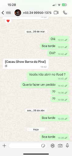 Na loja o atendimento é ok, nem bom, nem ruim, depende muito do dia e da vendedora. Mas não sei porque razão colocam a loja no Ifood se é impossível comprar por lá. Já pedi mais de 6 vezes e simplesmente todas as vezes o pedido foi cancelado por falta de aceitação da loja. O wpp leva dias pra responder. Enfim, acho um descaso com o cliente que pede, fica aguardando, e quando vê seu pedido foi cancelado por falta de atendimento da loja. Sendo que até o pagamento é feito adiantado por pix pela plataforma. Detalhe: já tentei pedir VARIASS VEZES!...