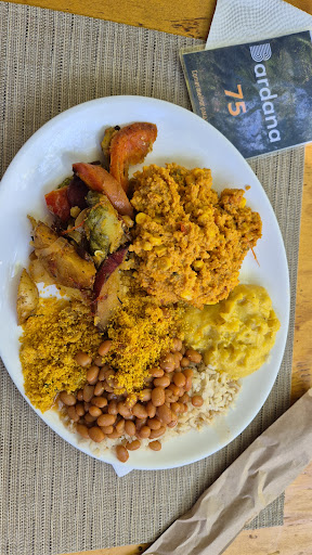 Read moreComida deliciosa, opção de carne, peixe e diversos pratos vegetarianos. O buffet não é enorme, mas tem uma variedade boa, que me agradou muito. A comida é bem feita, adorei a quiche de legumes, macarrão com cogumelos , quibe sem carne e feijoada vegana. O ambiente de mesas do fundo é mais fresco que o da frente e tem uma área aberta junto às árvores. Só achei pouca variedade de sucos. Tinham dois tipos na máquina. Se oferecem mais, não sei. Pra mim não foi oferecido. Garçonetes simpáticas. Apesar da moça do caixa ser simpática, não foi em apresentado o valor gasto, só perguntado se seria crédito ou débito e o valor inserido na maquininha, não oferecem CPF na nota, aliás, mesmo pedindo o CPF, não saiu...