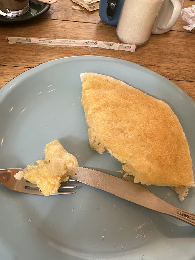 O cardápio tem muitas opções de pães simples e recheados (pedimos linguiça de frango com vinagrete e outros simples); tapioca e cuscuz; sucos da fruta - pedi maracujá com morango e veio praticamente um creme grosso das próprias frutas (impressionante). Minha sugestão é bater com pelo menos um pouquinho de açúcar (pra gente adoçar no copo gasta muito mais sachê e nem sempre fica no ponto). Chá mate com limão estava super forte (não consegui tomar). A salada de fruta estava perfeita (embora tivesse acabado iogurte e granola); bolos estavam bons também (pedimos gelado e banana com doce de leite). Não tinha tortilha de cebola com alho poró que estava no cardápio. Servem água da casa do filtro de barro (ótimo).