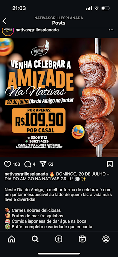 Read moreUm lugar diferenciado em diversos sentidos, essa churrascaria. Seguindo a ordem inversa aqui, o ambiente é amplo, agradável, claro, e bonito. Geralmente tem música ao vivo (e eles deixam bem avisado, inclusive o valor do couvert), e as atrações musicais que tocam lá geralmente são bem agradáveis, com repertório bom. Não é aquele tipo de música que atrapalha a refeição da gente. Em termos de serviço, é incrível. Os garçons e atendentes todos muito simpáticos, prestativos, e também proativos. Eu sempre me sinto muito bem-vinda lá - um dos motivos que sempre volto. Sobre o buffet: incrivelmente saboroso e variado. Volta e meia aparecem algumas coisas diferentes por lá, tipo tambaqui grelhado, por exemplo. Mas duas coisas que sempre têm no buffet e que me chamam a atenção são: camarão ao alho e óleo e diversas variedades de sushi, inclusive hot roll. As saladas são sempre frescas também, e a variedade de queijos e salames não deixa a desejar. Agora as carnes: Muita variedade e muito sabor! Não deixem de provar as carnes entremeadas com queijo, as carnes na parrilla e, em especial, o baby beef da picanha. Nossa. Sem brincadeira, uma das melhores carnes que já comi em churrascos! Vale muito a pena, de verdade! Outro ponto alto é o preço: acompanhem o Instagram deles! @nativasgrillesplanada Lá eles sempre divulgam as promoções do dia, e um rodízio (especialmente no jantar) pode acabar saindo bem em conta! Esse restaurante acabou por se tornar um dos meus lugares favoritos na cidade para comer bem, e eu faço sempre questão de voltar! E eu espero que vocês...