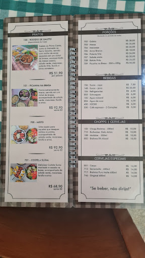 Casa especializada em rodízio de galeto com acompanhamentos diversos, mas também oferecem uma picanha na chapa e costela suína com os mesmos acompanhamentos, quais são: massa caseira, salada verde, salada de batata com maionese, polenta frita, farofa e arroz carreteiro.