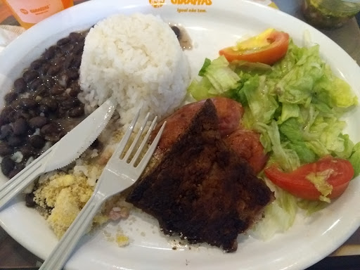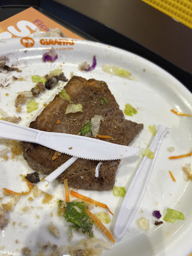 Read moreDecepcionado essa é a palavra, pedi um churrasquito na Linha Brasil, que me custou 30 Reais, para receber o prato a demora foi de 27 minutos, e pra piorar a carne estava sapecada, queimada, dura, desidratada, a salada parece que era o resto de ontem às folhas do alface estavam verde escuro e gosmenta, fora que pra piorar mais ainda a situação me foi disponibilizado taller de plástico isso mesmo PLÁSTICO pra cortar uma carne dura e ressecada, o que acabou por quebrar a faça pois não cortava nada, fui no balcão pedir um taller SEM ser de plástico e fui informado que não tinha. A carne q me foi servida nem meu cachorro come, fora q a comida veio fria, e a porção bem menor que as demais...