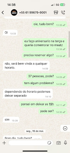 Estava organizando meu aniversário e entrei em contato com a Meatz Sudoeste perguntando se seria possível reservar, inicialmente, para 37 pessoas numa terça-feira. Me informaram que sim, desde que todos chegassem no horário. Com essa informação, convidei todos os meus amigos.