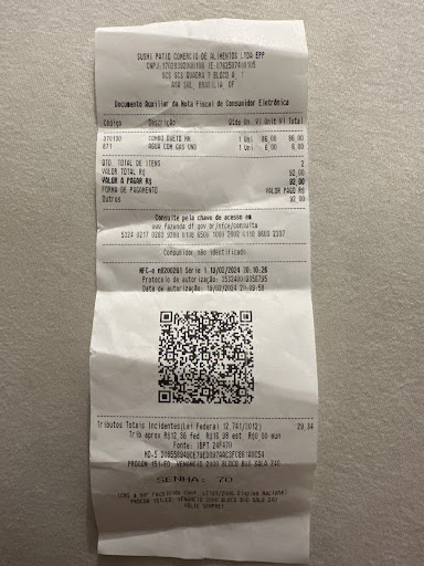 O caixa estava sozinho e a fila estava grande, só havia 1 sushiman na frente e outro fritando os pedidos na cozinha interna.