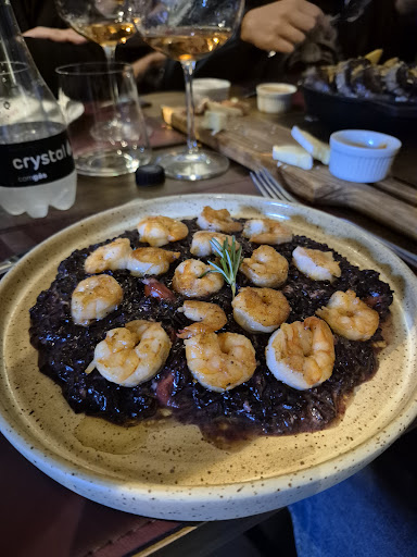 As opções dos pratos no cardápio são bem interessantes. Fui de arriz negro com camarões. Esta estavam excelente, saborosos, de bom tamanho e no ponto [não estavam borrachudos como é praxe aqui no DF].