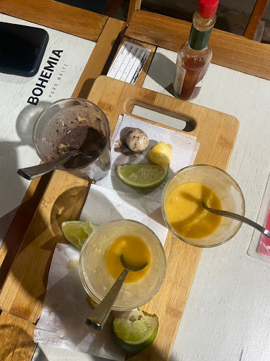 Os drinks são medianos (não sabem fazer uma espuma de gengibre) a caipirinha é gostosa, pedi um sangria. Drink simples mas muito gostoso, veio uma variedade de frutas dentro do drink. Os caldinhos também não tem muito gosto, deveriam colocar mais ingredientes no caldinho e também temperos. as coxinhas estavam ótimas e o molho é uma delícia.