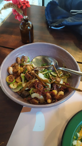 O serviço é bom, mas pode melhorar. Acredito que, pela ausência de um sistema mais preciso, os garçons acabam se confundindo. No meu caso, a experiência foi ainda mais complicada: eu e outra pessoa da mesa pedimos o mesmo prato, mas o meu na versão vegana (a única disponível no cardápio), não veio. Após algum tempo, ele percebeu que seu prato não tinha carne e vinha com um ovo frito por cima (ele não come ovo). Foi nesse momento que entendemos que houve uma troca: o meu deveria ter vindo sem ovo e sem carne, enquanto o dele deveria conter carne e não ter ovo. Quando informamos o garçom sobre o equívoco e expliquei que não consumo nem carne nem ovo, ele – de maneira educada, mas demonstrando certa falta de preparo – nos disse que ajustaria o pedido. Ele nos garantiu que meu prato sairia rapidamente e que traria outro corretamente preparado para meu colega. No entanto, a espera foi longa até que minha refeição finalmente chegasse.