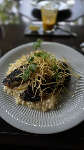 PRINCIPAL- Comi um risoto de alho poró com filé de tilápia em crosta de gergelim preto. A apresentação lindíssima, mas sem sabor. Não tinha gosto de nada, fiquei simplesmente pasma. Meu marido pediu um outro prato (carne), também lindo mas também sem sabor. Percebemos que faltava sal... Incrivelmente não conseguimos sal para a comida. Não tinha na mesa e pedimos para 2 pessoas diferentes e não veio.