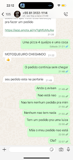 Pedi uma pizza pelo Rappi, demoraram uma hora para me entregar o pedido. Pedi explicações pelo WhatsApp e quem respondia o tempo todo era uma IA. Me responderam que o entregador estava chegando. Esperei mais meia hora e só descobri que o supongo pedido já estava lá porque fui atrás.