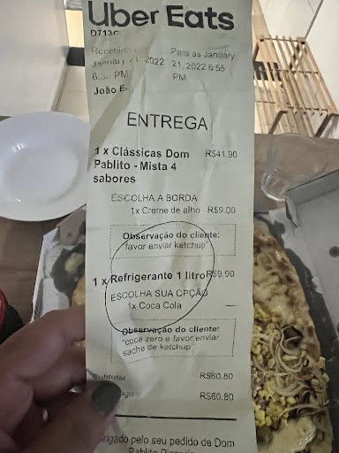 Read morePedi algumas vezes, já tive problemas mas sempre problemas que são aceitáveis. No último pedido que fiz além do atraso padrão, enviaram a pizza de camarão sem camarão! Óbvio que depois de atrasar sem chance alguma de esperar mais por uma possível troca, então a solução é aceitar e lembrar de não pedir mais depois de tantos problemas! Sinceramente não recomendo, na região existem outras pizzarias de qualidade superior por uma diferença de preço muito pequena na faixa...