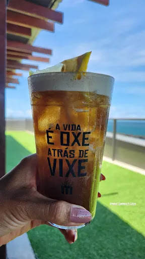 O local fica em um rooftop, no 7° andar de um prédio nas margens do porto de Recife. Tem uma bela vista, super arejado e espaçoso. Ambiente é super descontraído, agradável, com decoração simples e divertida. Fomos recebidos por duas recepcionistas no local que nos cadastrou em uma fila de espera (você consegue acompanhar a fila pelo app do celular). Escolhemos um domingo por causa do sambinha que tocava nesse dia. O lugar estava lotado, com uma fila de espera de cerca de 50 min. Decidimos esperar enquanto apreciávamos a paisagem e tirávamos algumas fotos. Tinham 9 mesas na nossa frente mas a fila andou rapidinho em cerca de 15 min fomos chamados pra uma mesa. Chegamos, sentamos numa mesa bem ao final do bar, numa área aberta. Percebemos um cheiro de esgoto bem forte que era cessado quando ventilava. Pedimos pra mudar de mesa e o gerente (Paulo), que por sinal, não parava um segundo trabalhando bastante, conseguiu nos alocar em uma mesa mais ao meio do bar (ainda bem!). Pedimos um chopp, estava frio, não estava gelado, logo mudamos pra long neck e daí seguimos. De entrada, pedimos uma croqueta de vatapá recheada com camarão que estava espetacular! Pedimos uma pimentinha pra acompanhar. Logo depois, experimentamos o caldinho de feijoada que estava uma delícia também. Soubemos que a Paella é o prato chefe da casa mas preferimos pedir um prato de cupim marinado com purê de macaxeira e queijo coalho. Gente, que espetáculo esse prato. Cupim super macio e suculento, bem temperado, serve bem 2 pessoas. Muito saboroso. Deixo aqui em destaque o som num bom volume, de boa qualidade. Os garçons são bem simpáticos e educados, bastante prestativos. Adorei que o uniforme deles é um macacão. Bem criativo e parece ser bastante confortável. O banheiro é fora do restaurante, bem limpo e espaçoso. Fica como pontos de melhoria: Melhor acolhimento da recepção (As recepcionistas são bem mal humoradas, até um pouco grossas. Achei bem estranho pois não é o habitual do povo recifense). Chopp pode ter ajuste da temperatura, o ideal é servir bem gelado, estava frio. As mesas do fundo do restaurante ficam com um cheiro bem desagradável, não sei se é possível saber de onde vem e tentar melhorar. Pontos positivos: Comida é bem gostosa, bem feita e bem servida. Educação e presteza dos garçons. Gerente (Paulo) resolutivo e muito educado. Recomendo conhecer. Sugiro que chegue cedo pra escolher uma boa mesa e...