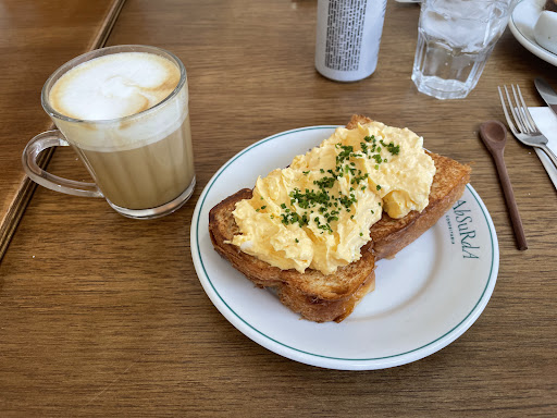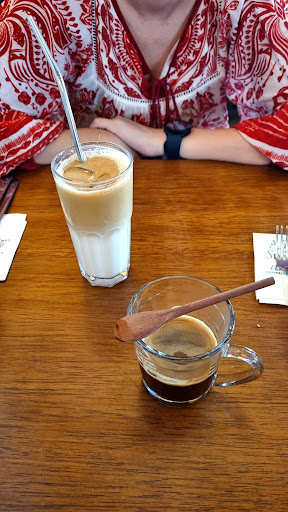 O ambiente é bastante agradável e aconchegante, com mesas na parte interna e externa. Apesar de cheio, ficamos na parte interna e não precisamos aguardar por uma mesa. Assim que nos acomodamos, fomos logo atendidos e pedimos pão com ovo e, para acompanhar, café expresso duplo e iced latte.