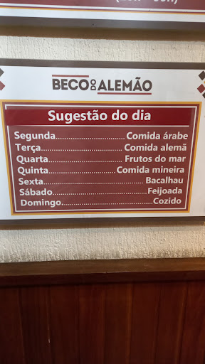 Obs.: Parabéns á administração que optou elegantemente por deixar as Tvs somente com a imagem e com legendas. Parabéns mesmo! deu um pouco de elegância ao que ja é tão feinho. Com toda minha “queixa “ , tenho por habito ir ao Beco do Alemão varias vezes por semana pois a comida que escolho ( Comida a kilo ) preenche minha percepção palatável. Enfim , sempre fico feliz com o que ponho em meu...