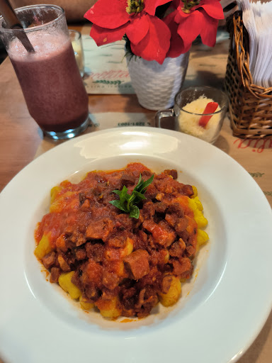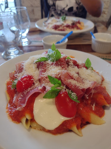 Olha, que comida DELICIOSA. Provei o gnocchi e senti que é um prato BEM encorpado, com azeitonas, e o molho de queijo é bem agradável. Meu prato era perfeito também: não economizaram no presunto di parma e a mussarela de búfala (que eu não costumo ser muito fã) também agregou muito! A porção é muito bem servida, e o queijo ralado servido à mesa e o azeite italiano são excelentes adições ao prato! A única coisa que senti falta foi de um pãozinho quentinho pra passar no prato no final da refeição, porque o molho sugo é uma delícia e com o manjericão fresco torna o prato impecável.