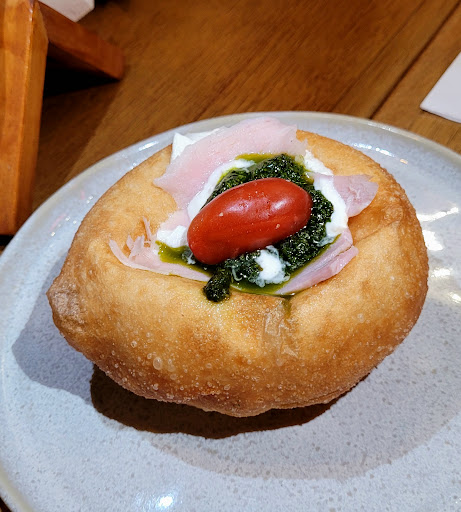 Começamos com a Pizza Fritta Ripiena, que era recheada com ricota de búfala, mussarela fior di latte e salame piccante. Era leve, cremosa e ricamente saborosa. Também apreciamos a Montanara a modo mio, uma mini pizza frita coberta com burrata, presunto royal e manjericão, com sua massa aerada ficou deliciosa.