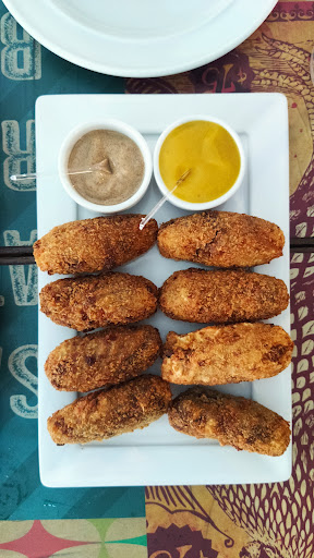 Pedimos uma porção de Pastéis (metade de camarão e metade de queijo), além de uma porção de croquete de costela. O Erik foi uma Pina Colada e um Lopes Trovão. Tudo veio muito rápido. A comida estava super quente! Vieram com molho de mostarda, mostarda escura e barbecue. Os pastéis são bem fritos e sequinhos, os bolinhos muito gostosos, com muita costela desfiada. Os drinks foram bem preparados. Sem nada a reclamar.
