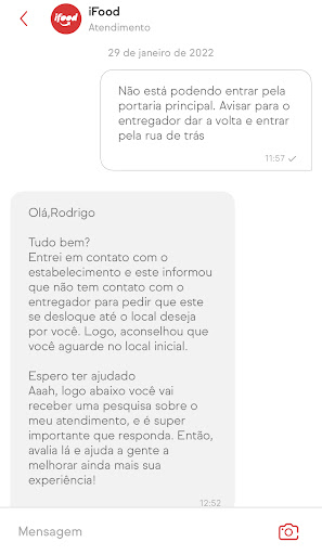 Read morePedi pelo iFood. Entrei em contato para pedir que a entrega fosse feita pela entrada de serviço, na rua de trás(regra do meu local de trabalho) . A loja falou que não tinha o contato do entregador e eu que esperasse no local indicado. O entregador por sua vez nem chegou perto do destino e cancelou sem ter pedido pro porteiro me interfonar nem ele mesmo tentou entrar em contato comigo pelo chat ou de qualquer outro jeito . Enfim , nota zero . Boa sorte pra vcs pois com essa maneira de tratar os clientes , vcs não vão...